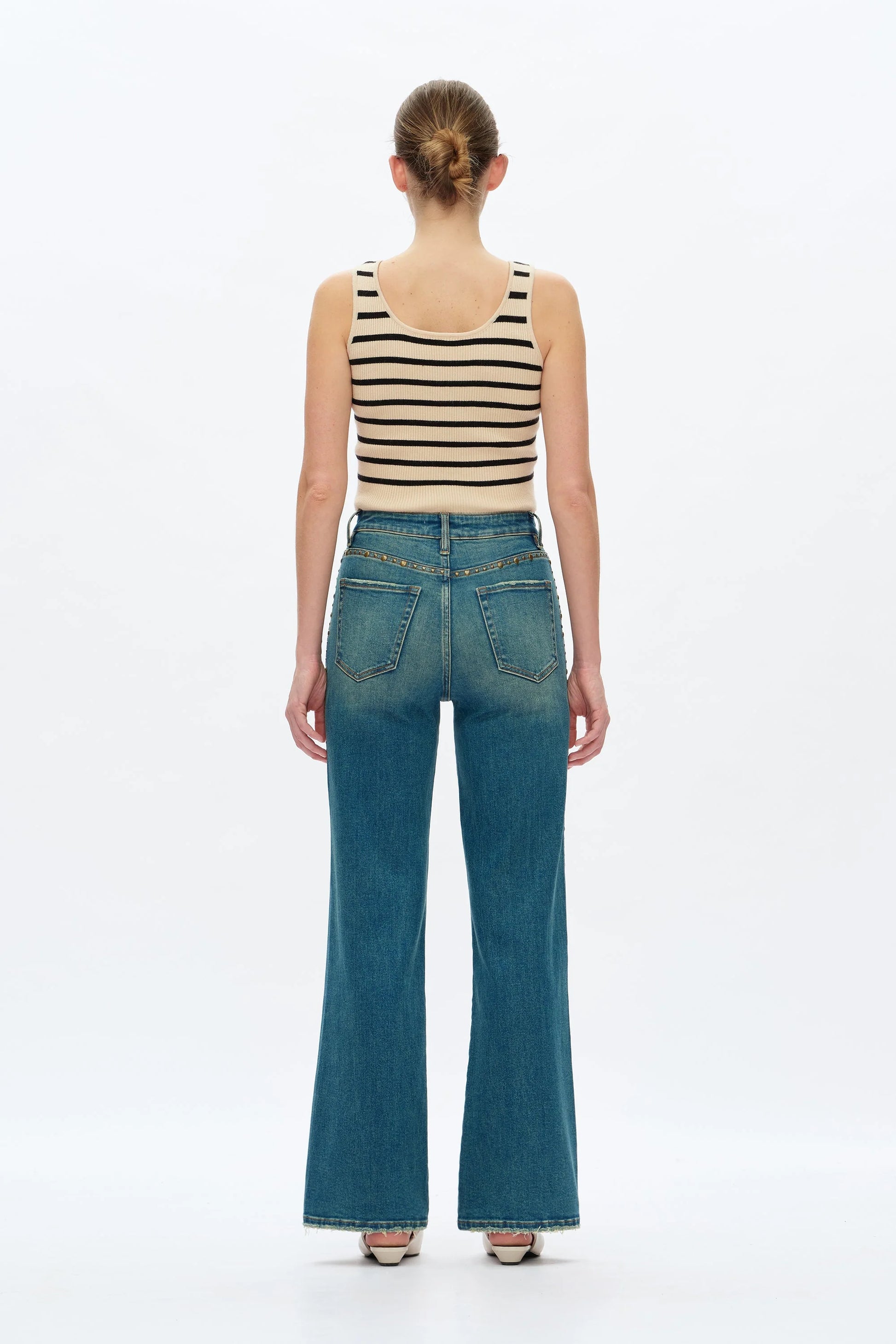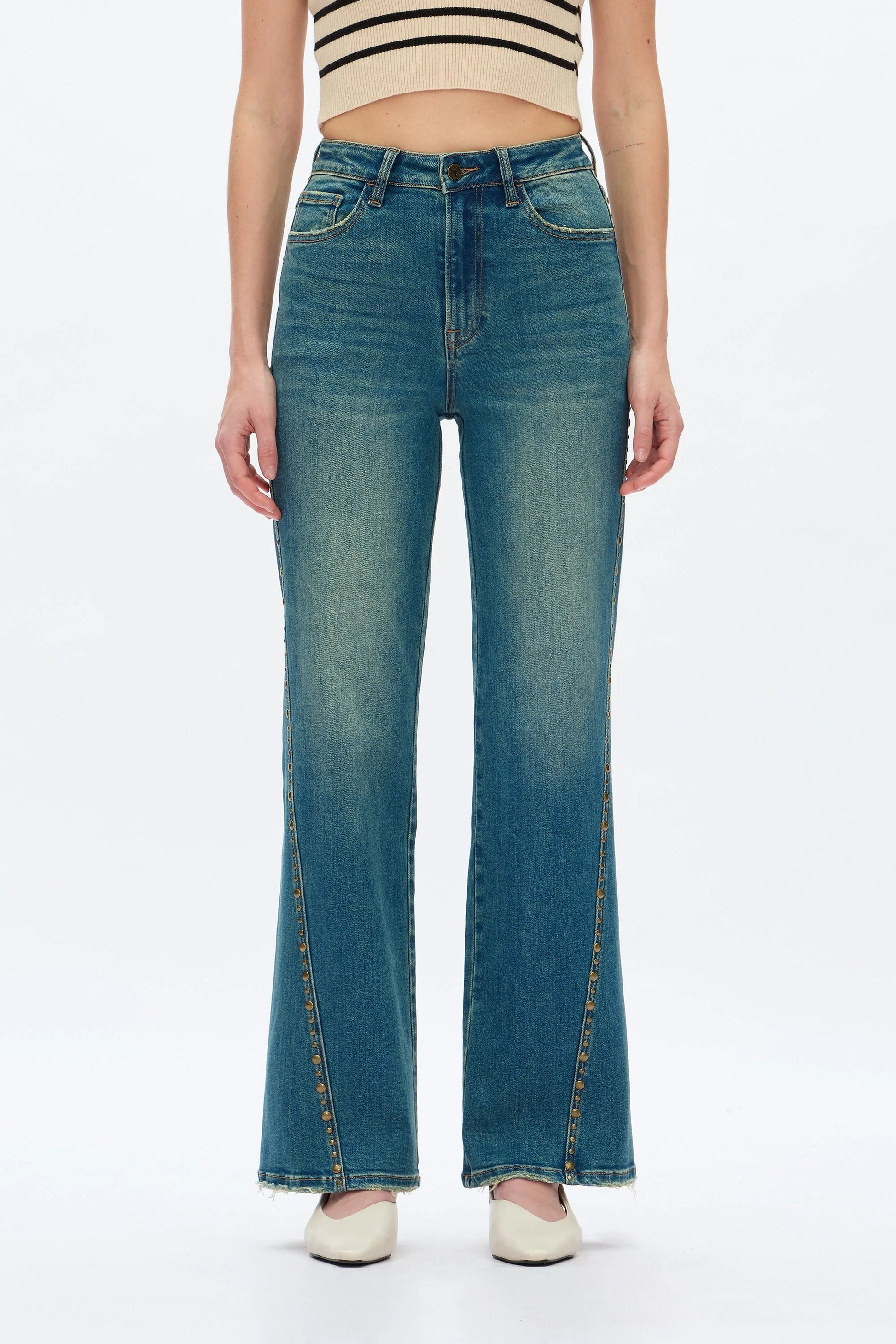 High rise wide leg jeans featured in a vintage feel featured in a comfortable stretch fabrication and 5-pocket styling with studded detailing.