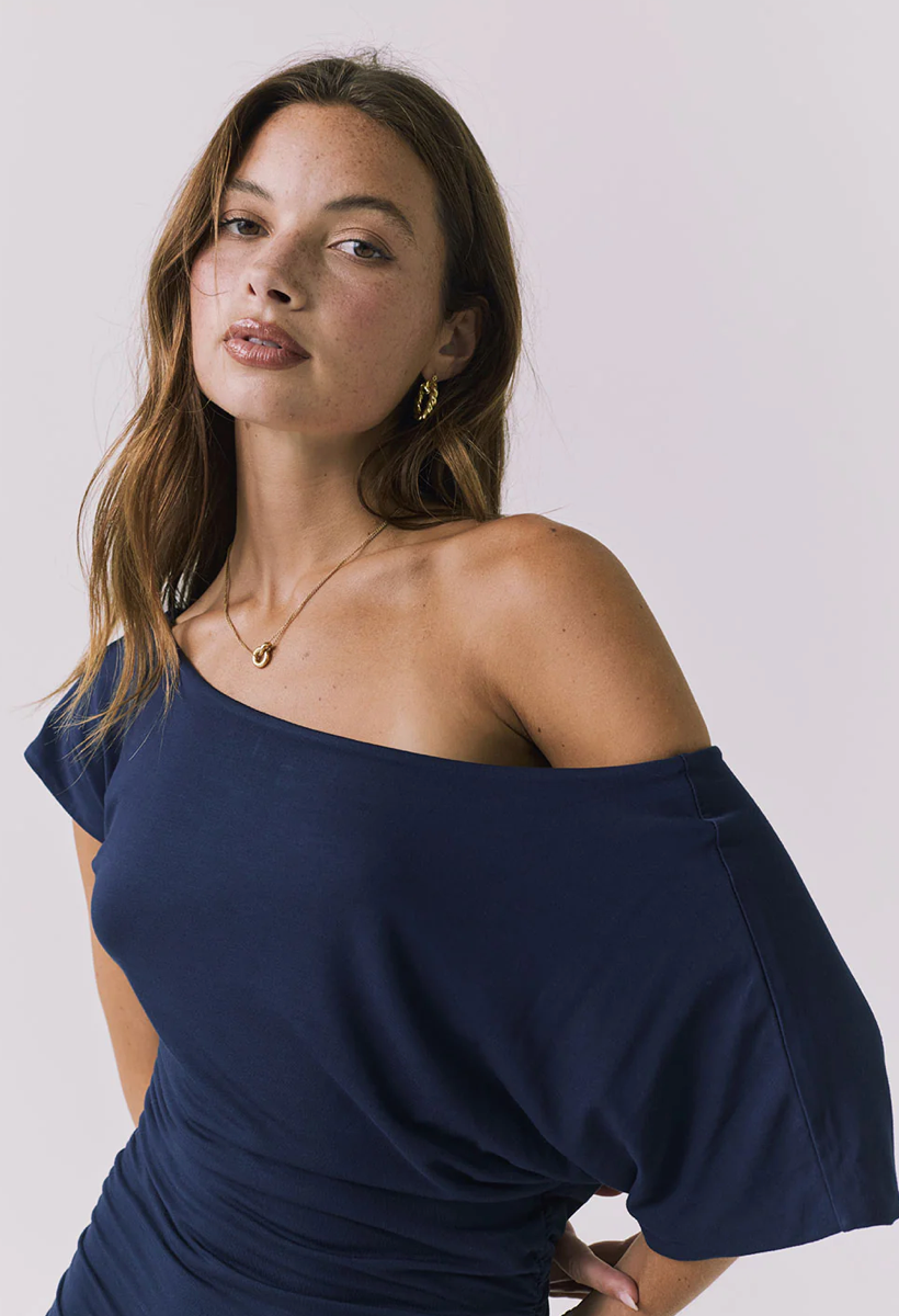 An elegant maxi dress in navy, June captures understated luxury with its flowing silhouette and refined proportions.