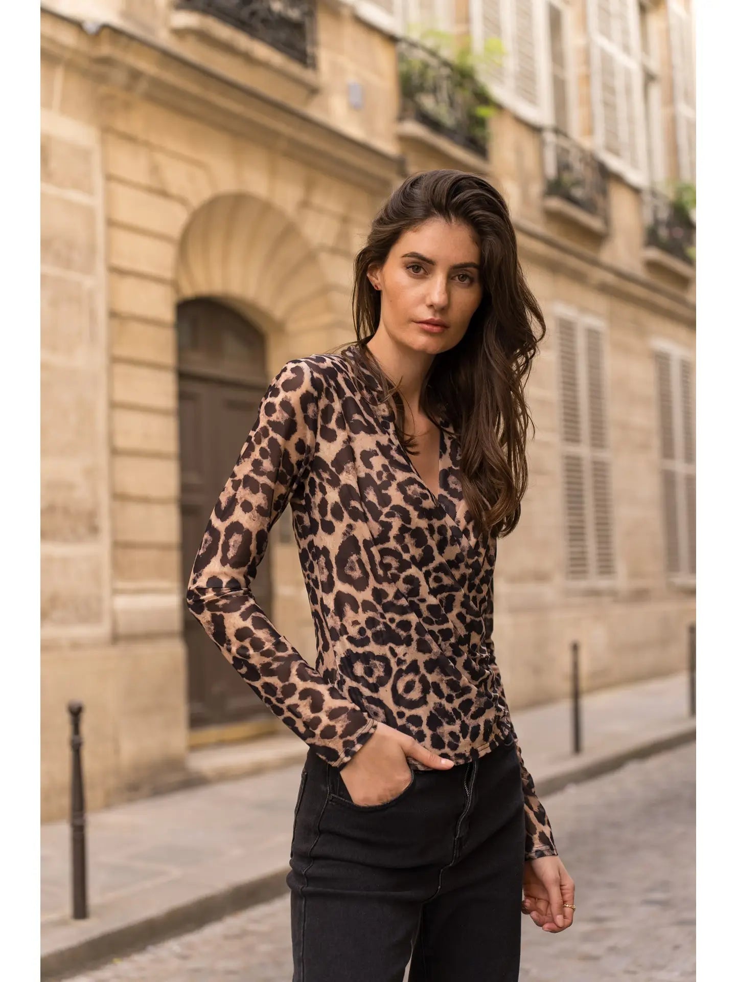 Leopard print mesh crossover top with ong sleeves in a sheer stretch mesh material