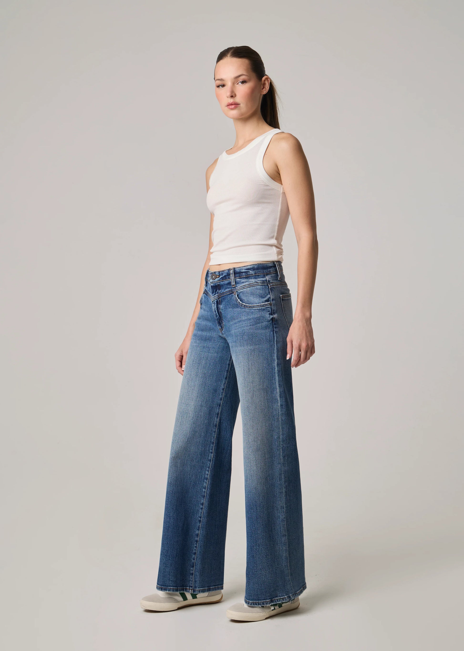 a roomy wide leg that has an easy fit through the hips, thigh and knee in a long inseam.