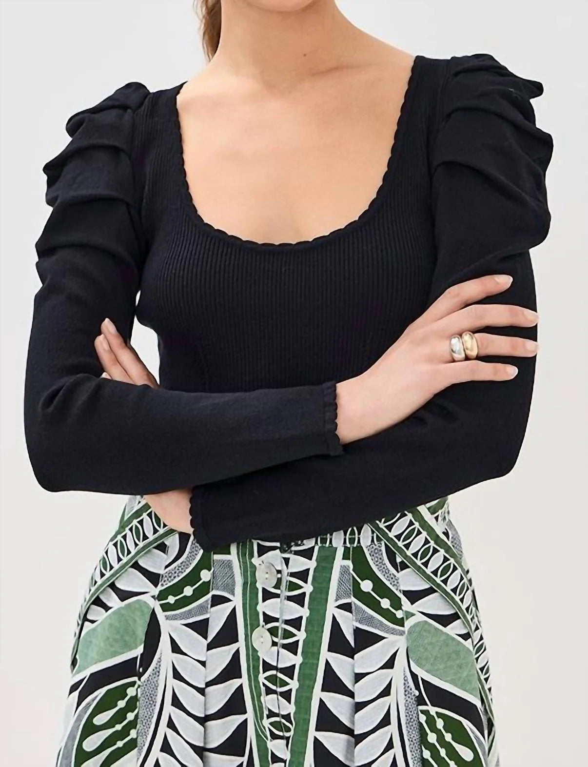 Embrace your playful side with the Black Knit Blouse from FARM Rio. This charming piece features a round neckline, complemented by dramatic ruffled shoulders that add a flirty twist to the classic black blouse. Its snug fit and delicate ribbed texture offer a cozy yet chic silhouette, perfect for pairing with bold patterns or simple solids. Indulge in the unique blend of comfort and style with this delightful wardrobe staple.