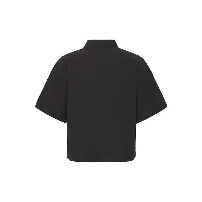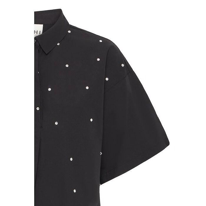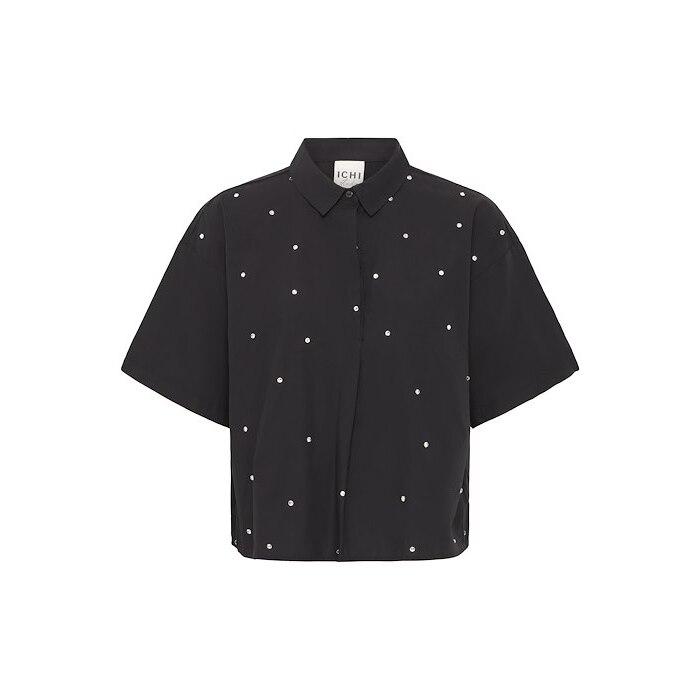 Cropped boxy button down rhinestone shirt in black.
