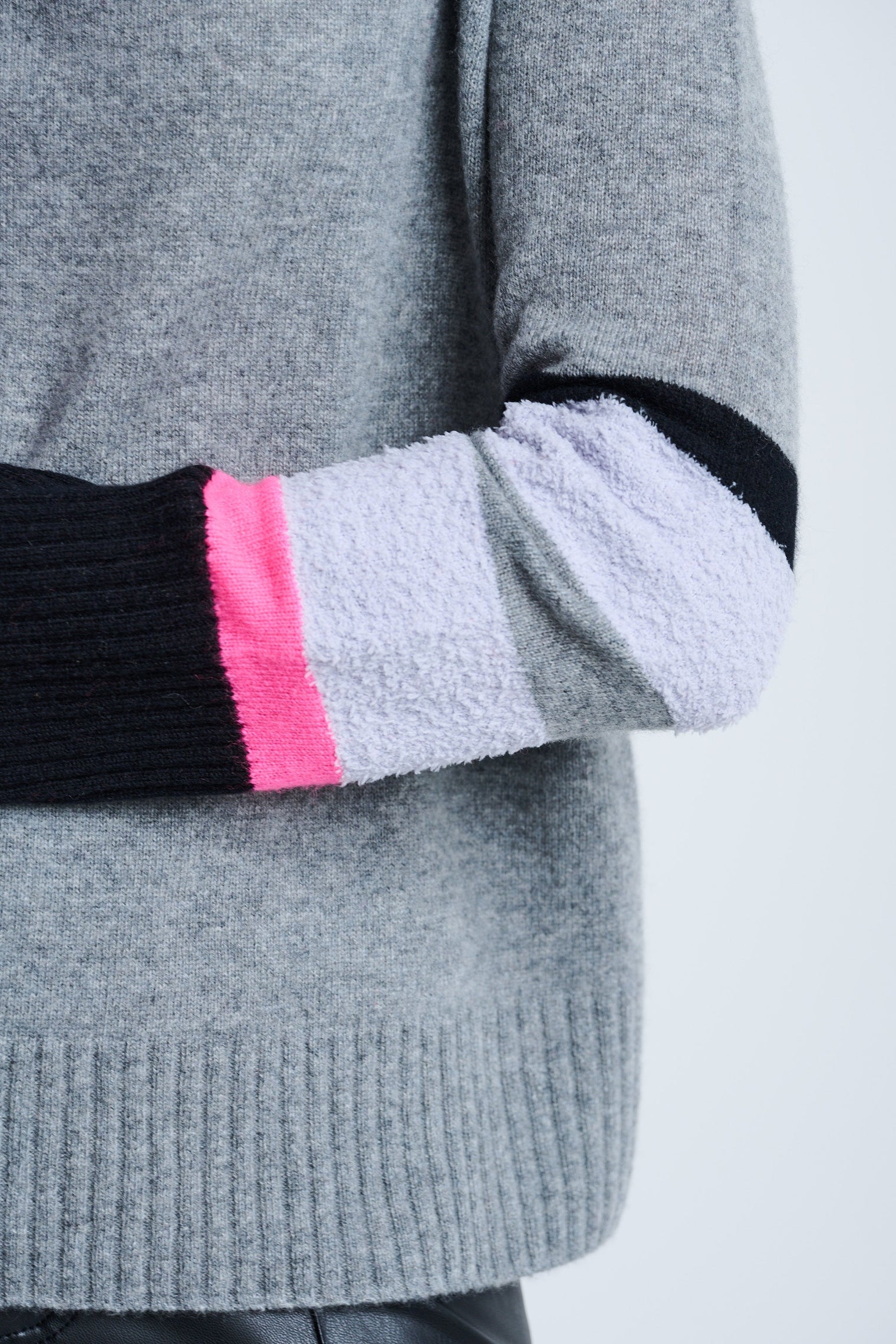 Subtle texture meets tonal contrast in the Cuff Luck pullover mock neck. The sleeves are popped with stripes of color, while mixed stitching adds an elevated detail. Knit from pure Cashmere for a luxurious yet wearable feel.