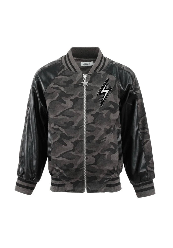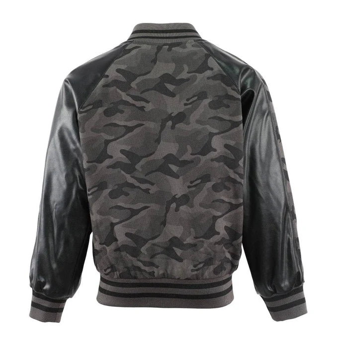 • Bold and stylish camo bomber jacket with sleek faux leather sleeves for an edgy, contemporary look.