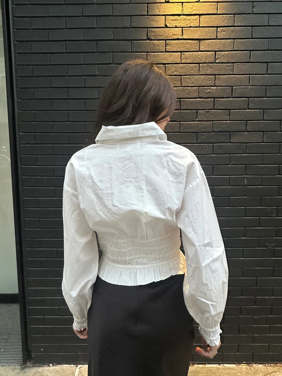 Love the Label’s take on a classic button-down: meet the Rolo Top in our cotton poplin fabric in white. It features a collared neckline and a button-down placket with delicate shell buttons at the center front. The waist is cinched with soft smocking and finished with a ruffled hem. Your go-to flattering button-down, pair it with the Wanda Skirt for a black and white matching moment.