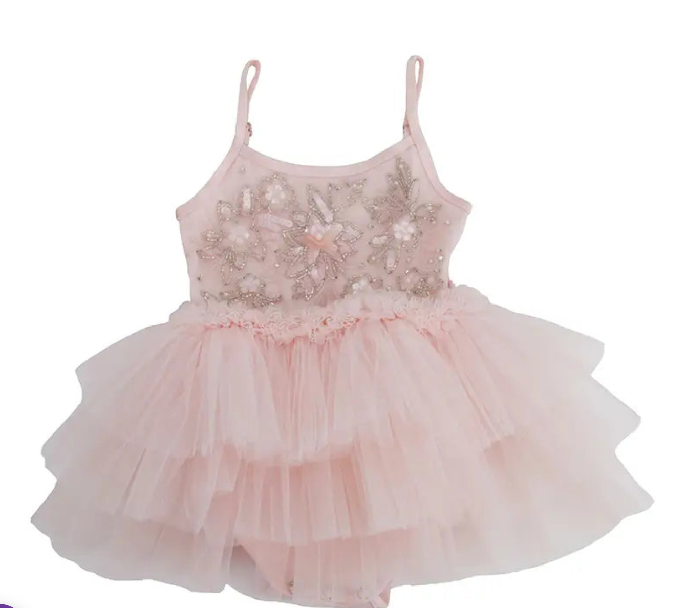 The cutest fleur baby onesie in blush pink with intricate flour detailing on the top.