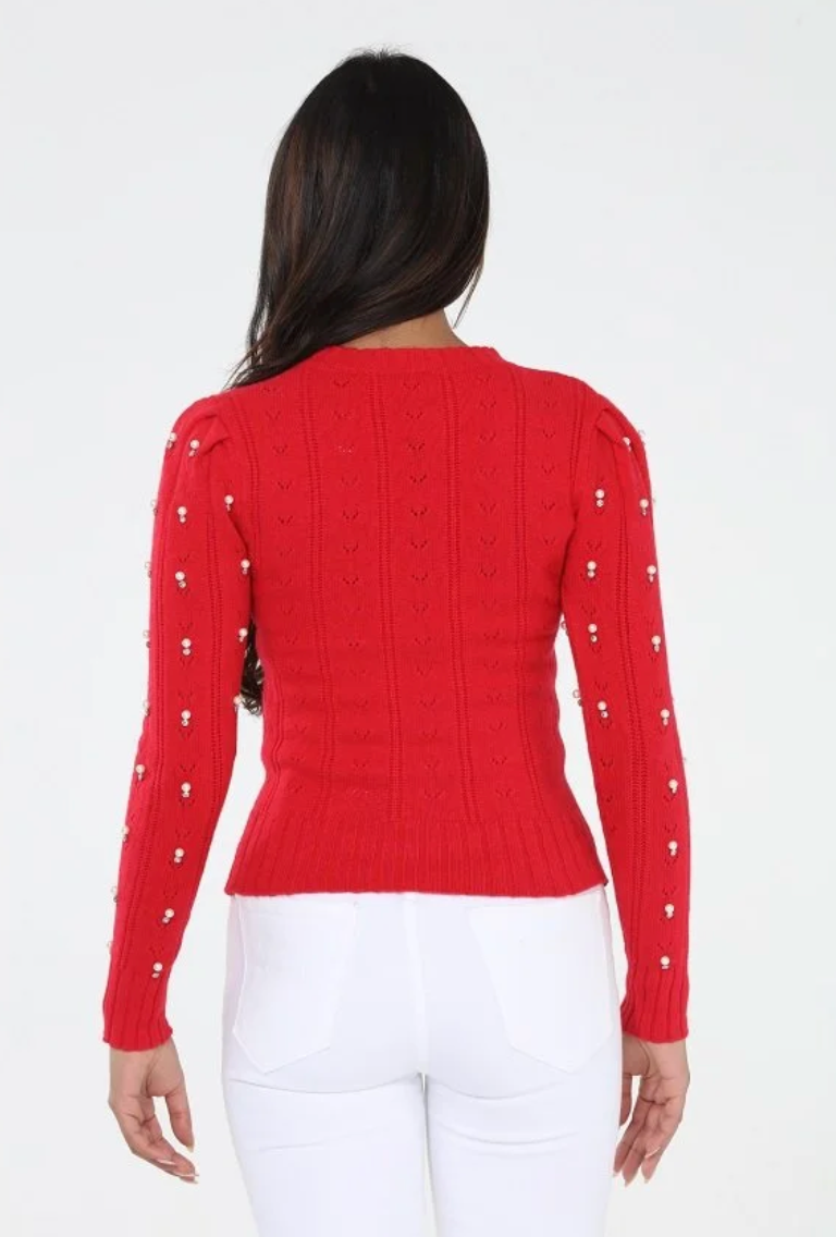 THIS COZY LONG-SLEEVE SWEATER FEATURES A FUN KNIT PATTERN AND SEQUIN DESIGN, ADDING A TOUCH OF SPARKLE AND WARMTH TO YOUR LOOK. AVAILABLE IN RED AND BLACK