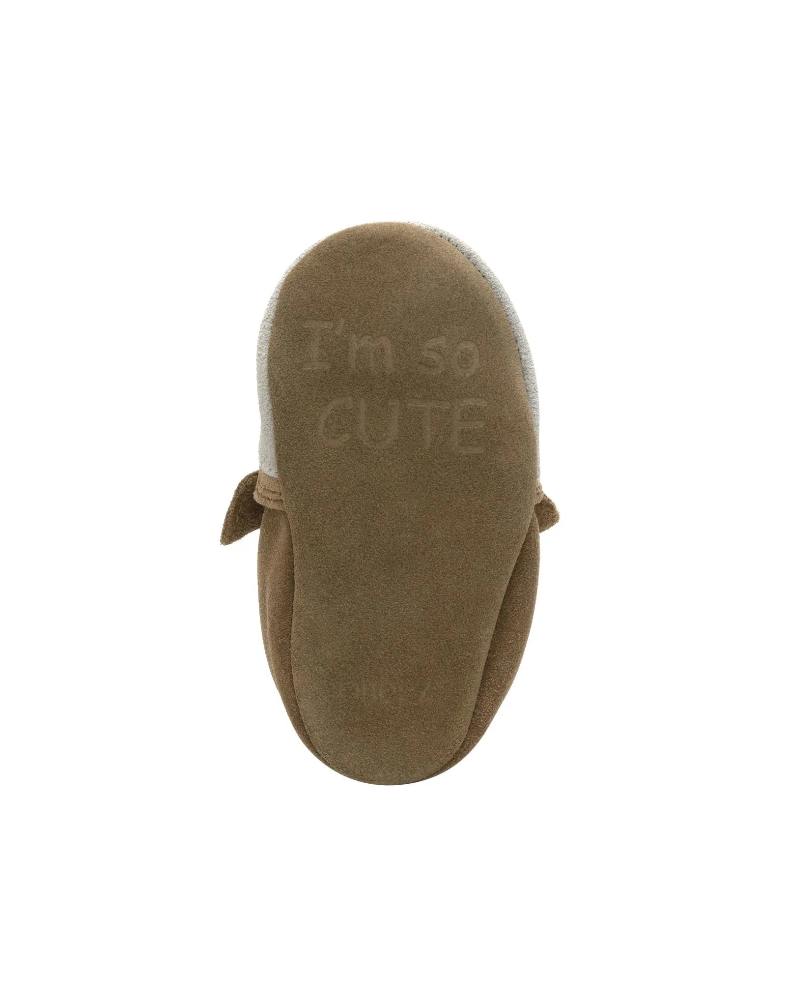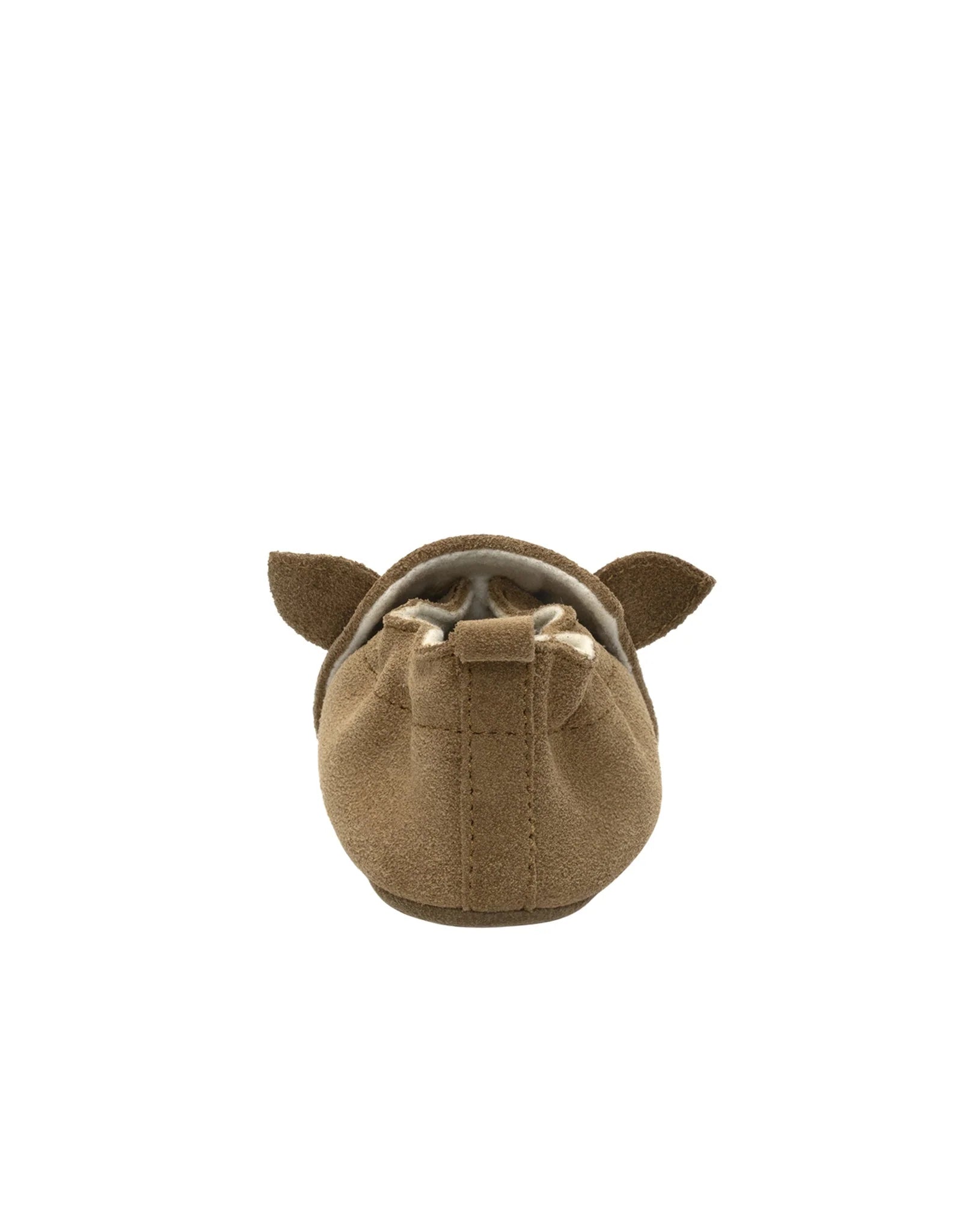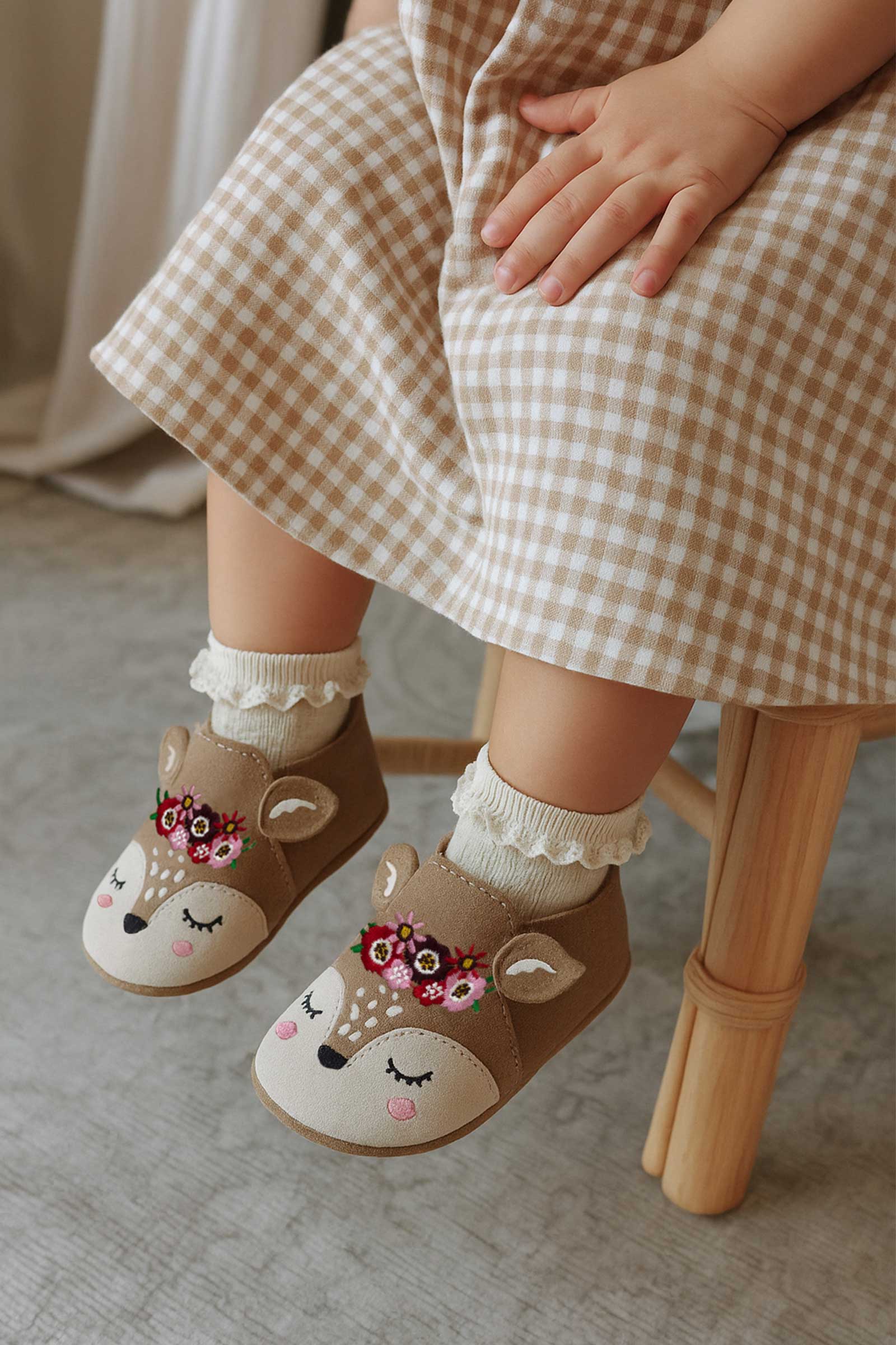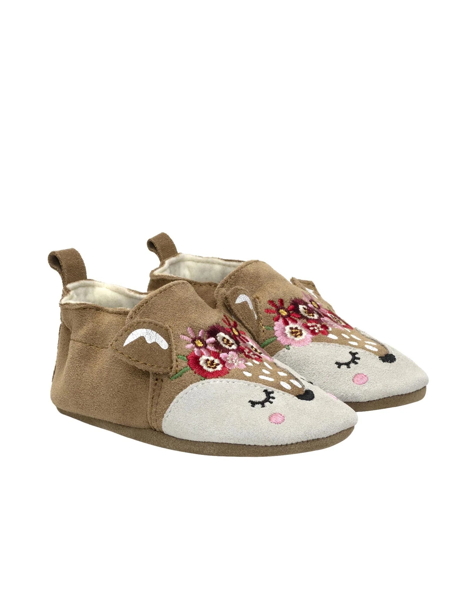 She is so cute and will look even cuter in the new Josephine soft soles shoe in camel suede. Featuring a floral baby deer design with 3D ears and a cute face applique. This style has a suede bottom & room to grow, they're flexible with movement & non-constricting for better balance and stay on, play on power