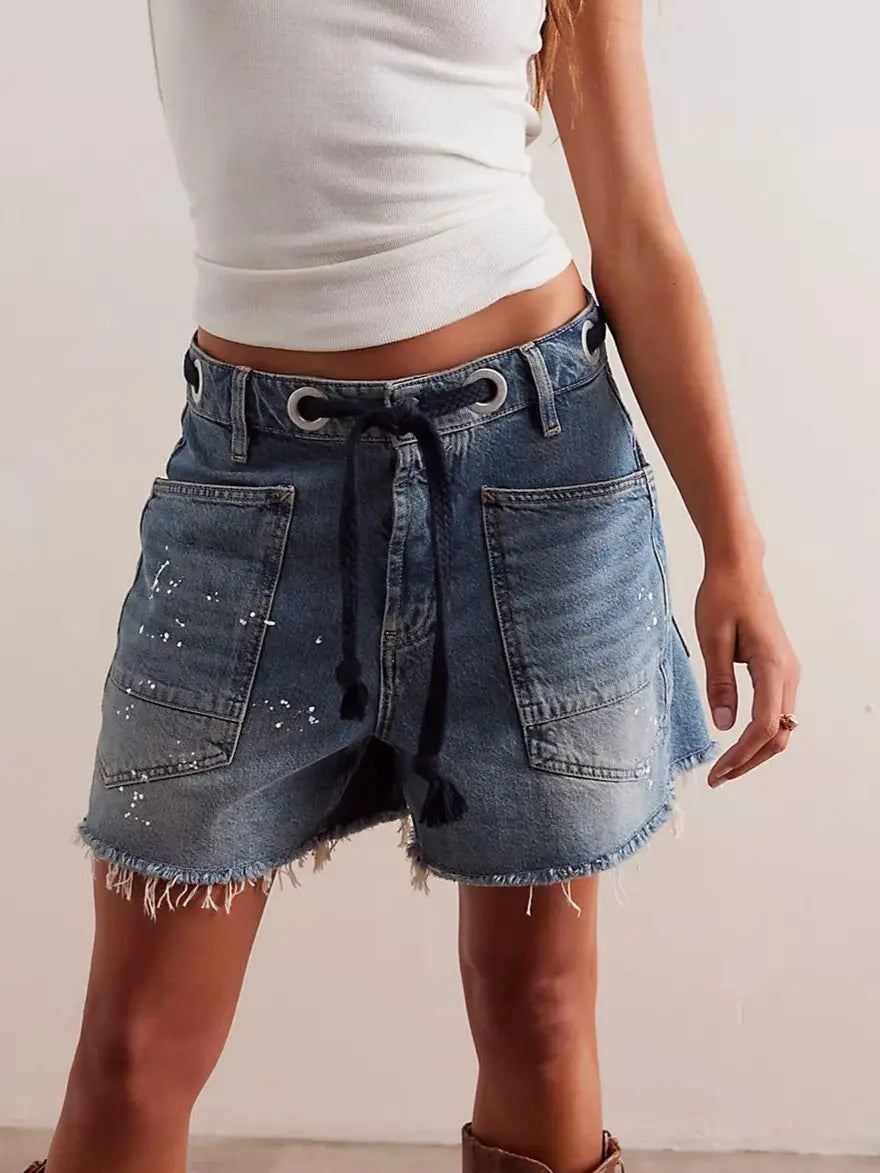 Casual wide leg denim short with 5 pockets and drawstring waist.