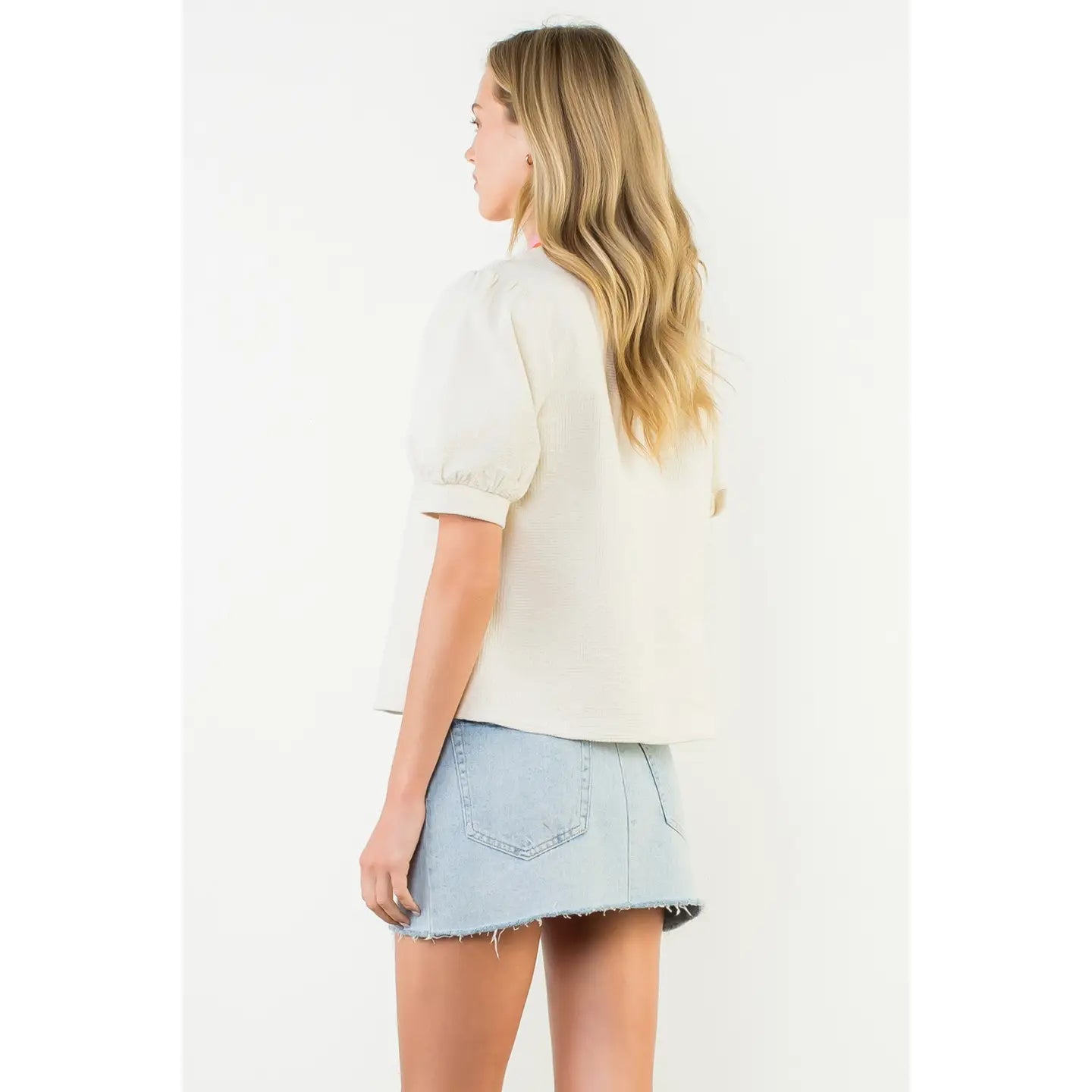 Sweet cream top with puff sleeve and v-neck detail. Perfect with jeans or a mini skirt and boots.