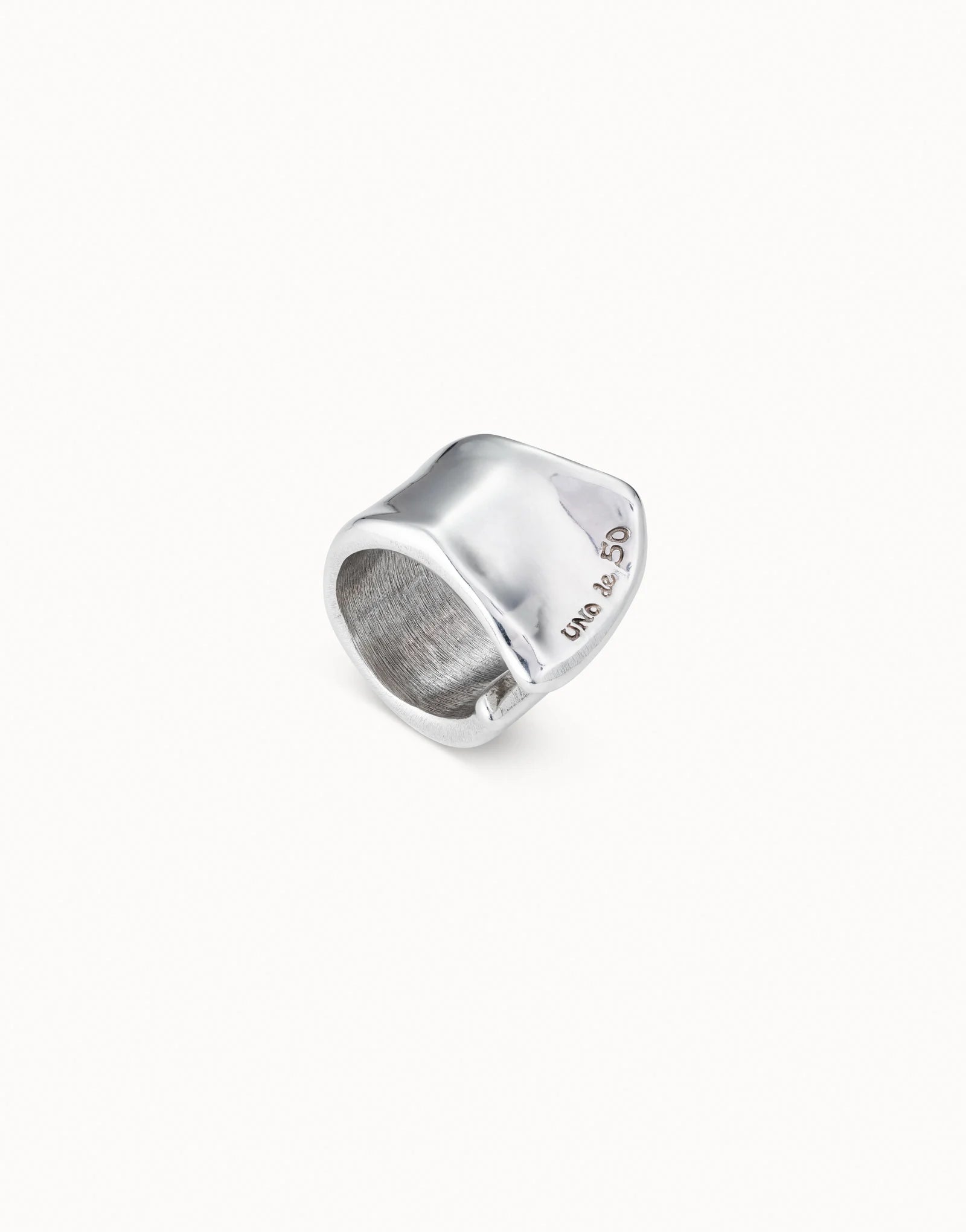 This classic, distinctively UNOde50 ring is an original design featuring a subtle opening and the logo engraved along the top. Handmade in Spain from a silver-plated metal alloy using artisan techniques. Wear it with other pieces by the brand to create a captivating look.